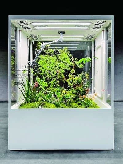展廳一側(cè),三個立方體環(huán)境模擬艙并排放置,分別在近7立方米的空間內(nèi)模擬了雨林、海島、沙漠三種生態(tài)環(huán)境,引來許多觀眾圍觀?!霸诟邩橇至⒌亩际?,很多人都向往擁有一方屬于自己的自然天地。為人們在室內(nèi)打造一片‘原始森林’便成了我們的使命?!逼放苿?chuàng)始人李軍介紹,設(shè)計過程中,團隊遇到的一大的難點就是在保證室內(nèi)環(huán)境舒適度的同時,讓各類植物健康生長?!巴ㄟ^設(shè)計師的努力,我們首次將人造太陽光源、溫濕度控制、空氣流通、智能微噴等系統(tǒng)整合于室內(nèi)種植模擬環(huán)境中,實現(xiàn)了室內(nèi)種植智能化、自動化、現(xiàn)代化?!崩钴姳硎荆鲈O(shè)計亦要遵循自然法則,“人與自然和諧共生”是團隊始終不變的設(shè)計宗旨。