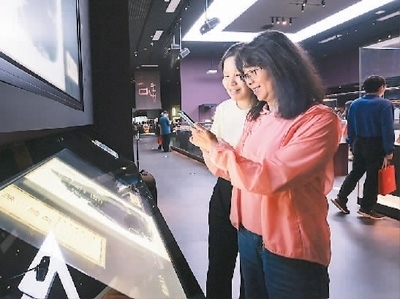 兩位觀眾在中國考古博物館內(nèi)的“甲骨互動體驗(yàn)區(qū)”參與體驗(yàn)活動。新華社記者 李 賀攝