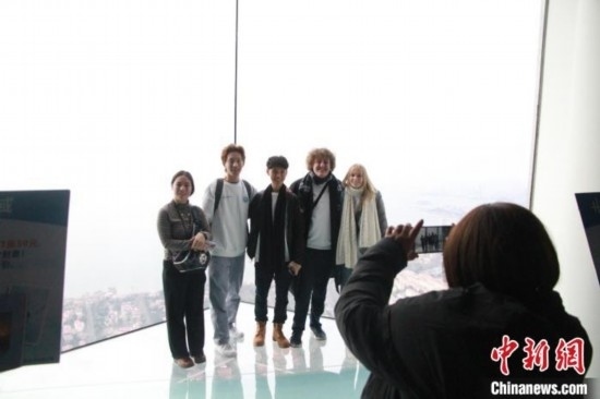 美國高校學生在青島海天中心城市觀光廳合影留念。王宇軒 攝
