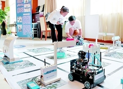 上海電子信息職業(yè)技術學院的師生展示智能機器人創(chuàng)新開發(fā)項目。 新華社發(fā)