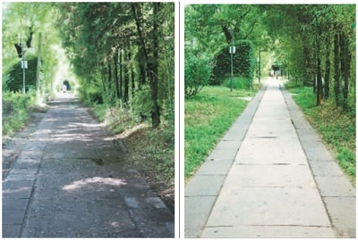 左圖:保護項目對燕南園水泥路修復(fù)前的景象。右圖:保護項目對燕南園水泥路進行修復(fù)后的效果。燕南園保存下來的水泥路以“脫漿彩石混凝土”工藝進行施工,老校友稱之為“洋灰路”。這里的“洋灰路”已有76年歷史,大部分仍能正常使用。北大建筑與景觀設(shè)計學院的李迪華老師發(fā)現(xiàn),燕南園東側(cè)水泥路破損后,顯露出大小和顏色都參差不齊的石子。于是,他開始追溯這些“洋灰路”的歷史價值,與北大“燕園公益營建社”的黃可同學翻閱北大檔案館資料,找到了歷史照片。又幾經(jīng)輾轉(zhuǎn),尋訪到了九旬高齡的老校友。研究發(fā)現(xiàn),燕園中最早的水泥路修建于1948年。為此,李迪華大力呼吁保護這些水泥路,尋訪到專門修復(fù)歷史路面的施工團隊,對少量保存完整的路面進行修復(fù);破損的洋灰原料則被回收,取出原骨料,采用相同的工藝進行還原。不僅老材料得到循環(huán)利用,歷史道路的價值也“凝固”在更新后的路面中。