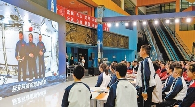 陜西延安科技館“天宮課堂”第四課地面課堂,學生在向航天員提問。鄧志宏攝(新華社發(fā))
