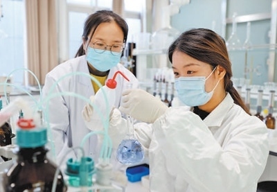 山東省棗莊市西王莊鎮(zhèn)一個實驗室內,碩士研究生晁齊齊(右)在做化學實驗。孫中喆攝(人民視覺)