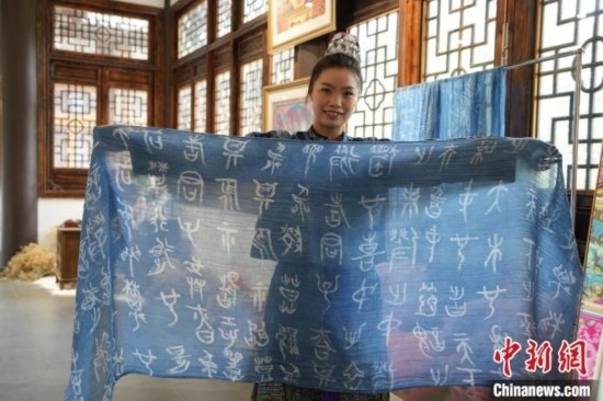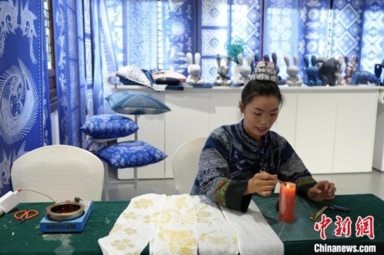 貴州織金苗族蠟染2021年6月入選國務(wù)院公布第五批國家級(jí)非物質(zhì)文化遺產(chǎn)代表性項(xiàng)目名錄?!?5后”苗族女孩王秋雨大學(xué)畢業(yè)后回到織金,成為一名織金苗族蠟染推廣者。她不僅使用傳統(tǒng)小臘刀,還使用大臘刀和毛筆,以蜂蠟為墨在絲巾、衣服、箱包上繪制小篆、甲骨文、山水等文字與圖案,這些蠟染產(chǎn)品深受消費(fèi)者喜愛。圖為6月19日,王秋雨在織金縣平遠(yuǎn)古鎮(zhèn)的依文織金數(shù)字化展廳制作蠟染。周燕玲 攝