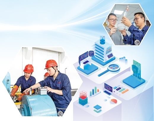 圖①:東港熱電公司博士創(chuàng)新站博士(左)與企業(yè)員工討論實驗反應結果。圖②:東港熱電公司員工(右)帶領參與博士創(chuàng)新站實踐工作的大學生檢修設備。