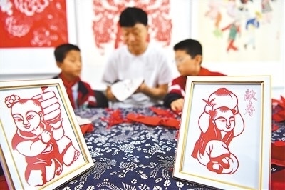 山東高密姜莊鎮(zhèn)產(chǎn)學研實踐基地內,非遺傳承人指導小朋友剪紙。李海濤攝(人民圖片)