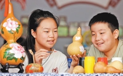 山東省棗莊市龍山路街道非遺作坊,小學(xué)生在學(xué)習(xí)制作彩繪葫蘆。 孫中喆攝(人民視覺)