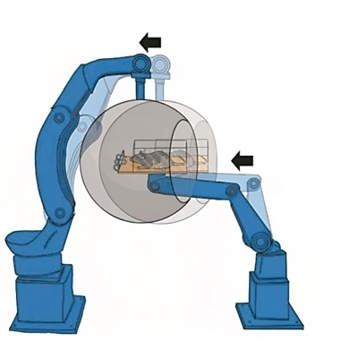 為了破解動(dòng)物在完全黑暗的管道、隧道中也能迅速轉(zhuǎn)彎、穿越障礙,并準(zhǔn)確地抵達(dá)目的地的秘密,科學(xué)家們?cè)O(shè)計(jì)了一種獨(dú)特的運(yùn)動(dòng)模擬器。該模擬器采用同步的工業(yè)機(jī)械臂來(lái)模擬不同的運(yùn)動(dòng)狀態(tài)。實(shí)驗(yàn)中,老鼠被放在模擬器中接受各種運(yùn)動(dòng)刺激,儀器同時(shí)報(bào)告它們感知到的運(yùn)動(dòng)方向。結(jié)果顯示,老鼠對(duì)極其微小的氣流變化都異常敏感,它們確實(shí)能夠利用這種氣流信息,增強(qiáng)自身對(duì)運(yùn)動(dòng)的感知和判斷力。