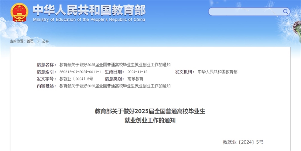 記者11月13日從教育部獲悉,教育部近日印發(fā)通知,部署做好2025屆全國普通高校畢業(yè)生就業(yè)創(chuàng)業(yè)工作。通知提出實施2025屆全國普通高校畢業(yè)生就業(yè)創(chuàng)業(yè)促進和服務體系建設行動,全力促進高校畢業(yè)生高質量充分就業(yè)。