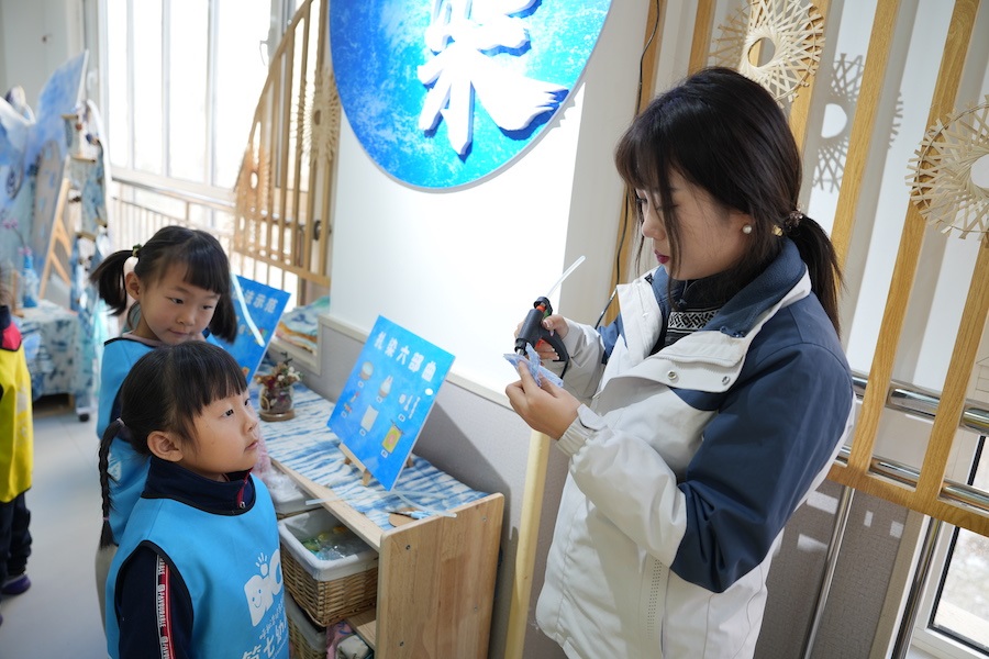 劉曉菲表示,利用幼兒園走廊寬的優(yōu)勢(shì),把一樓打造成閱讀長(zhǎng)廊,二樓藝術(shù)長(zhǎng)廊,包括扎染、剪紙、造紙、拓印等非遺項(xiàng)目,三樓創(chuàng)造長(zhǎng)廊,包括卡卡建構(gòu)、炫彩建構(gòu)、扭扭建構(gòu)、墻釘游戲、機(jī)械探索等。
