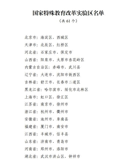記者2月10日從教育部獲悉,經(jīng)各地自主申報(bào)、省級推薦、網(wǎng)絡(luò)公示等環(huán)節(jié),認(rèn)定北京市海淀區(qū)等61個(gè)國家特殊教育改革實(shí)驗(yàn)區(qū)。