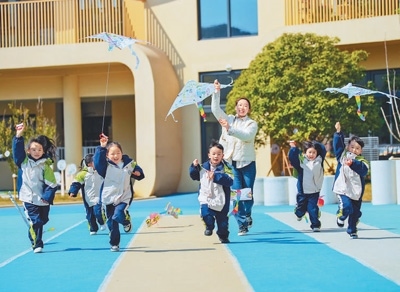 浙江省湖州市長興縣泗安鎮(zhèn)中心幼兒園,孩子們和老師一起放飛彩繪風(fēng)箏。