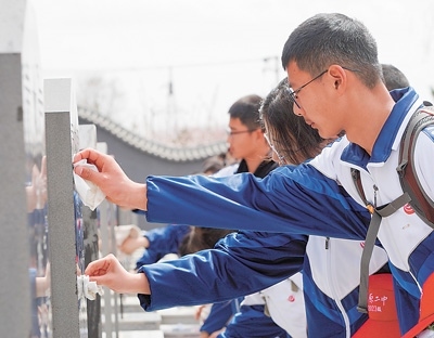 2024年4月3日,學生在任山河烈士陵園擦拭烈士墓碑。