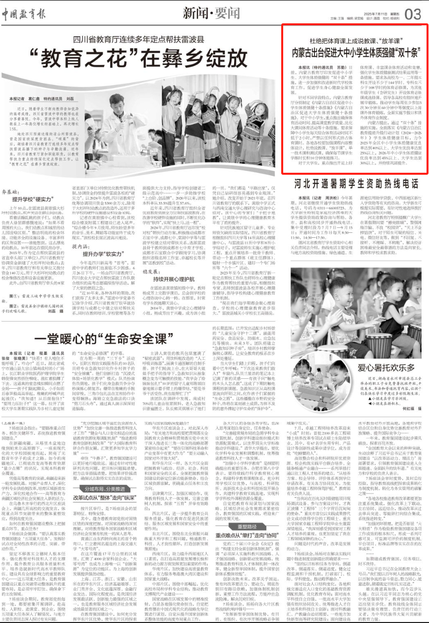 2025年7月11日,《中國教育報(bào)》第3版刊發(fā)題為《杜絕把體育課上成說教課、“放羊課”內(nèi)蒙古出臺促進(jìn)大中小學(xué)生體質(zhì)強(qiáng)健“雙十條”》的文章,報(bào)道了內(nèi)蒙古教育廳印發(fā)促進(jìn)中小學(xué)生、大學(xué)生體質(zhì)強(qiáng)健的“雙十條”措施,進(jìn)一步加強(qiáng)和改進(jìn)新時代學(xué)校體育工作,促進(jìn)學(xué)生身心健康全面發(fā)展。