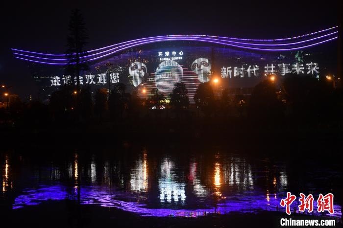成都環(huán)球中心被第三屆中國國際進口博覽會標語“點亮”?!埨恕z