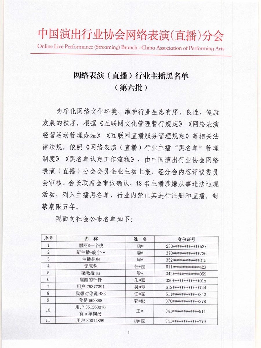 根據(jù)《互聯(lián)網(wǎng)文化管理暫行規(guī)定》《網(wǎng)絡(luò)表演經(jīng)營(yíng)活動(dòng)管理辦法》《互聯(lián)網(wǎng)直播服務(wù)管理規(guī)定》等相關(guān)法律法規(guī),按照《網(wǎng)絡(luò)表演(直播)行業(yè)主播“黑名單”管理制度》《黑名單認(rèn)定工作流程》規(guī)定,中國(guó)演出行業(yè)協(xié)會(huì)網(wǎng)絡(luò)表演(直播)分會(huì)現(xiàn)向社會(huì)公布第六批主播黑名單,被列入黑名單的主播將在行業(yè)內(nèi)禁止注冊(cè)和直播,封禁期限5年。(總臺(tái)央視記者曹巖)