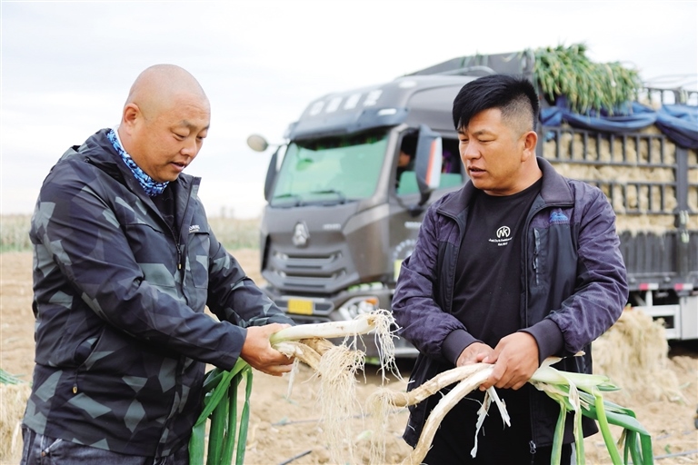 正在忙著收蔥打捆的村民于新穎說:“看這蔥長(zhǎng)得多好!”