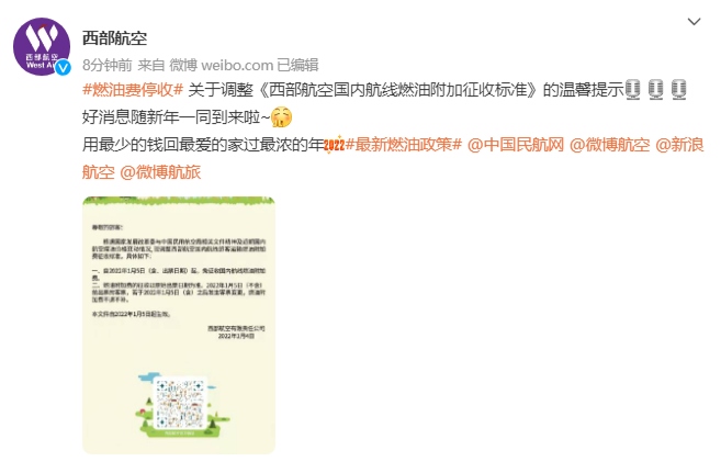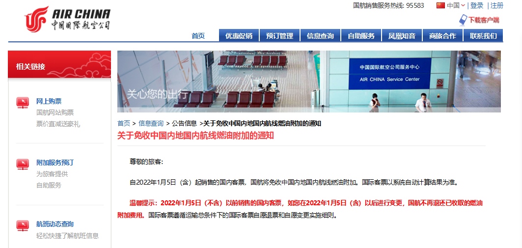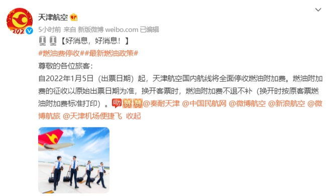 今日,中國國際航空、海南航空、天津航空、西部航空等多家航空公司發(fā)布通知,根據(jù)國家發(fā)展改革委、民航局的相關(guān)文件精神,自2022年1月5日零時起(出票日期),取消征收國內(nèi)航線燃油附加費。