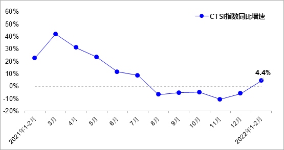 數(shù)據(jù)顯示,2022年1-2月,中國運輸生產(chǎn)指數(shù)(CTSI)均值為153.8點,同比增長4.4%。分結構看,CTSI貨運指數(shù)均值為188.2點,同比增長4.1%;CTSI客運指數(shù)均值為83.8點,同比增長4.7%。