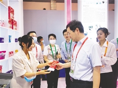 第二屆中國國際消費(fèi)品博覽會(huì)(以下簡稱消博會(huì))在海南省海口市舉辦。內(nèi)蒙古展館的綠色優(yōu)質(zhì)產(chǎn)品引來圍觀。蒙牛乳業(yè)、敖漢小米、科爾沁牛肉、芥花油等內(nèi)蒙古多個(gè)綠色優(yōu)質(zhì)品牌及產(chǎn)品亮相消博會(huì)。同時(shí),70多家交易商組成內(nèi)蒙古展團(tuán)觀展。本屆消博會(huì)主題為“共享開放機(jī)遇共創(chuàng)美好生活”,于7月25日開幕,為期6天。(文/圖 本報(bào)記者 李永桃)
