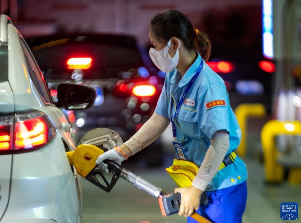 8月9日,江蘇無錫一加油站工作人員給汽車加油。新華社發(fā)(還月亮 攝)