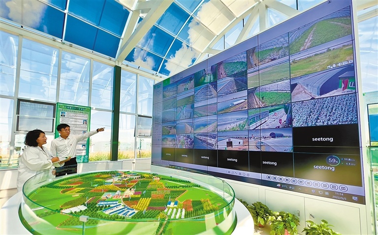 近日,巴彥淖爾市杭錦后旗二道橋鎮(zhèn)鄉(xiāng)村振興設(shè)施農(nóng)業(yè)產(chǎn)業(yè)園區(qū)工作人員正在記錄現(xiàn)代農(nóng)業(yè)數(shù)字平臺(tái)監(jiān)測(cè)數(shù)據(jù)。據(jù)悉,該園區(qū)占地2000畝,投資4600萬(wàn)元,是集智慧農(nóng)業(yè)管理、引黃滴灌示范、集中連片種植等多項(xiàng)功能為一體的現(xiàn)代農(nóng)業(yè)產(chǎn)業(yè)園區(qū)。通過(guò)現(xiàn)代農(nóng)業(yè)數(shù)字平臺(tái),進(jìn)行智能管控、農(nóng)產(chǎn)品質(zhì)量檢測(cè)、科技培訓(xùn)、遠(yuǎn)程科技指導(dǎo),同時(shí)讓更多的農(nóng)戶利用APP與平臺(tái)共享數(shù)據(jù)資源,實(shí)現(xiàn)田間自動(dòng)化管理。園區(qū)通過(guò)平臺(tái)智能管控,今年第一茬種植麒麟西瓜,第二茬計(jì)劃種植葉菜類(lèi),兩茬畝均效益預(yù)計(jì)在2萬(wàn)元以上。(記者 孟和朝魯 攝影報(bào)道)