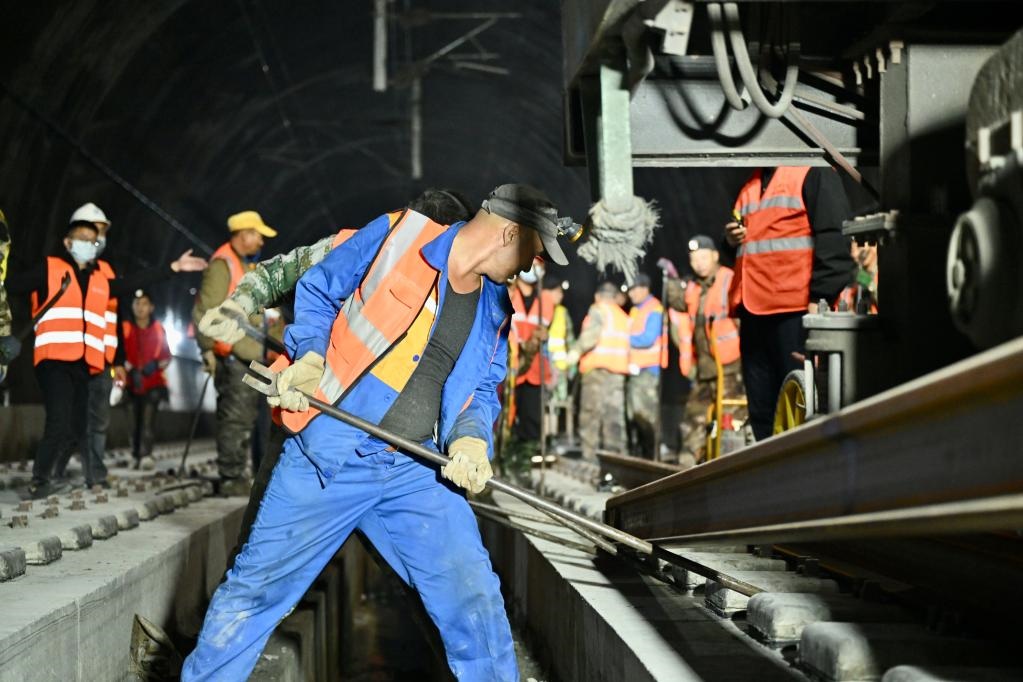 建設(shè)者們在完成全線鋼軌的最后鋪架。(中國鐵路成都局集團公司供圖)