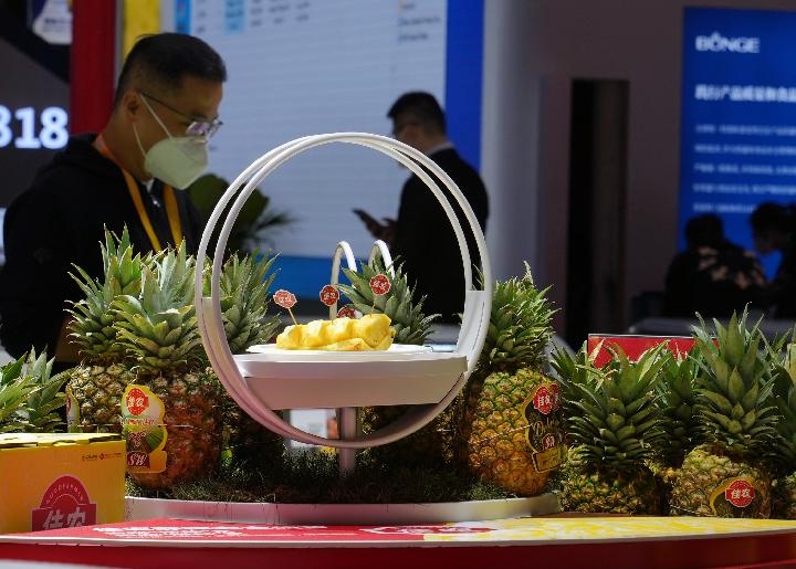 11月5日在第五屆進(jìn)博會(huì)食品及農(nóng)產(chǎn)品展區(qū)拍攝的菲律賓黑鉆鳳梨。新華社記者 劉穎 攝