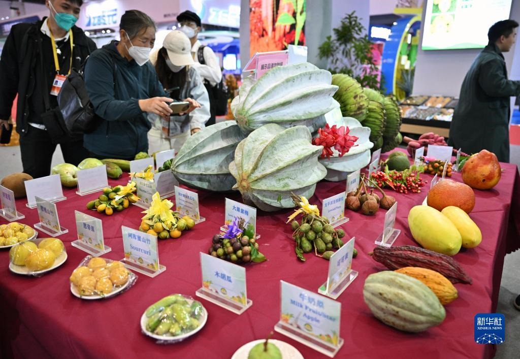 12月15日,觀眾參觀世界熱帶水果之窗展臺(tái)展示的熱帶水果。新華社記者 郭程 攝