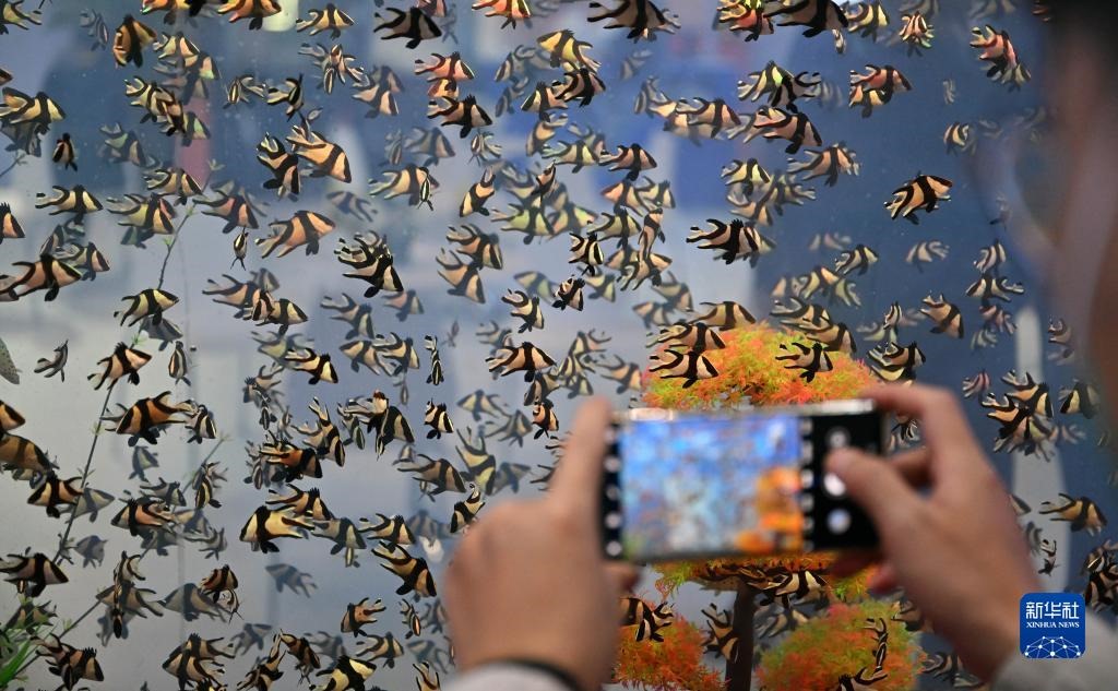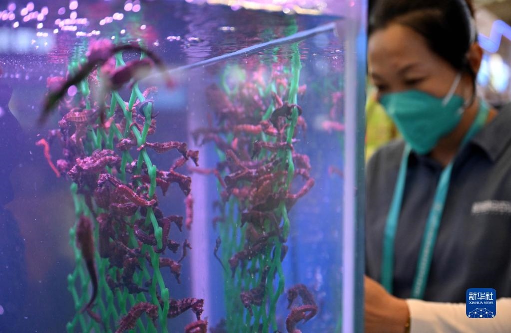 12月15日,觀眾在參觀海南文昌展臺(tái)展示的養(yǎng)殖海馬。新華社記者 郭程 攝