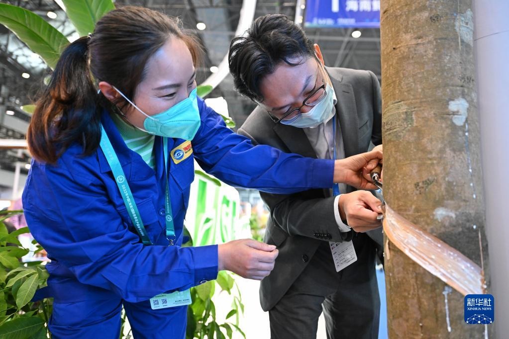 12月15日,觀眾在工作人員的指導(dǎo)下體驗(yàn)割膠。新華社記者 郭程 攝