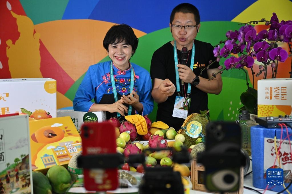 12月15日,海南三亞展臺(tái)的工作人員在直播銷售農(nóng)產(chǎn)品。新華社記者 郭程 攝
