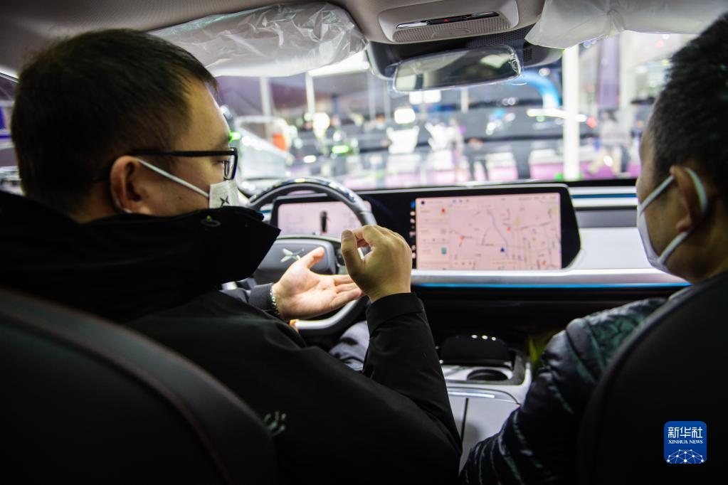 12月24日,在長(zhǎng)沙國(guó)際會(huì)展中心,工作人員(左)向觀眾介紹展車。新華社記者 陳思汗 攝