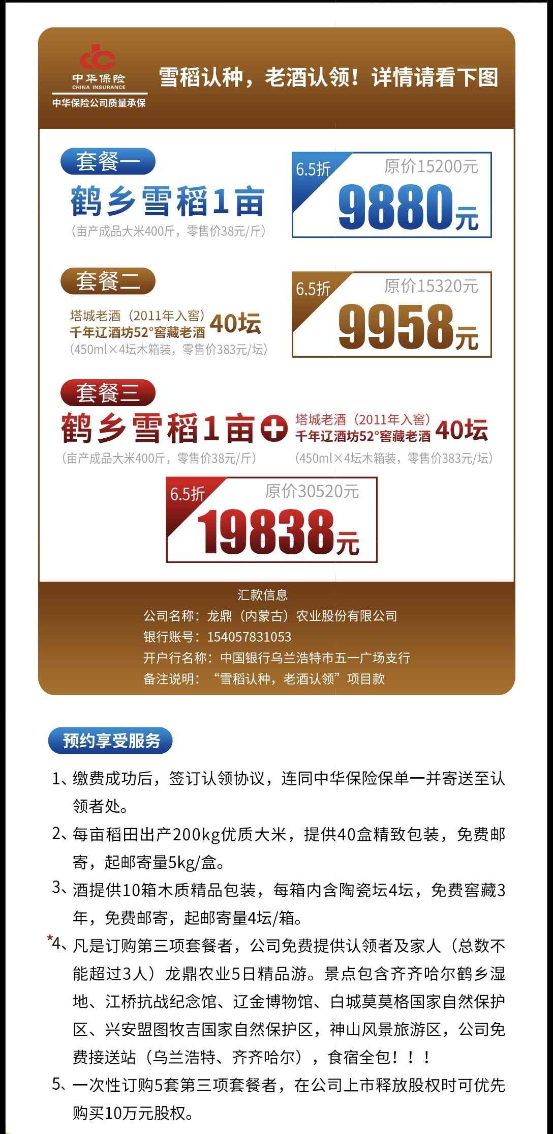 目前,“雪稻認種、老酒認領(lǐng)”共有三種認領(lǐng)套餐(如圖),認領(lǐng)第三種套餐,全家可享有龍鼎農(nóng)業(yè)5日深度精品游,景點包含齊齊哈爾鶴鄉(xiāng)濕地、江橋抗戰(zhàn)紀念館、遼金博物館、白城莫莫格國家自然保護區(qū)、興安盟圖牧吉國家自然保護區(qū)、神山風(fēng)景旅游區(qū),公司免費接送站(烏蘭浩特、齊齊哈爾) ,食宿全包。