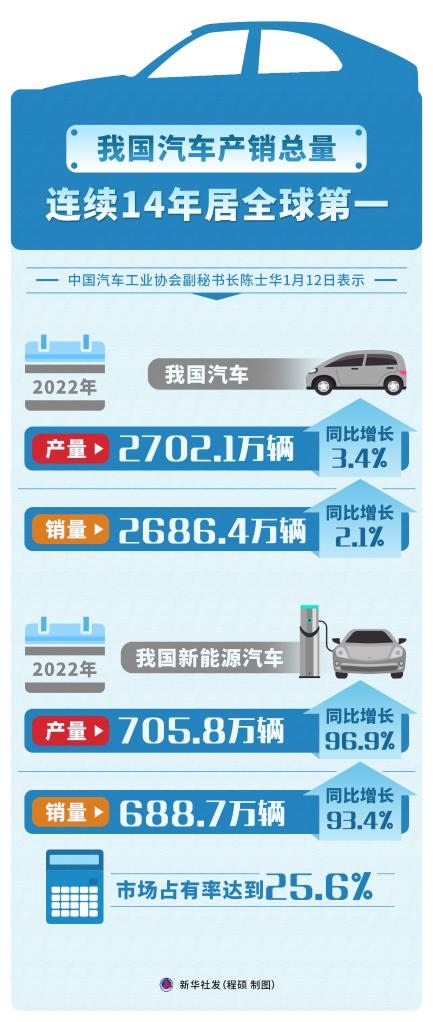 中國(guó)汽車(chē)工業(yè)協(xié)會(huì)副秘書(shū)長(zhǎng)陳士華在12日舉行的中國(guó)汽車(chē)工業(yè)協(xié)會(huì)月度信息發(fā)布會(huì)上表示,2022年,我國(guó)汽車(chē)產(chǎn)銷(xiāo)分別完成2702.1萬(wàn)輛和2686.4萬(wàn)輛,同比增長(zhǎng)3.4%和2.1%,全年實(shí)現(xiàn)小幅增長(zhǎng)。我國(guó)汽車(chē)產(chǎn)銷(xiāo)總量已連續(xù)14年居全球第一。