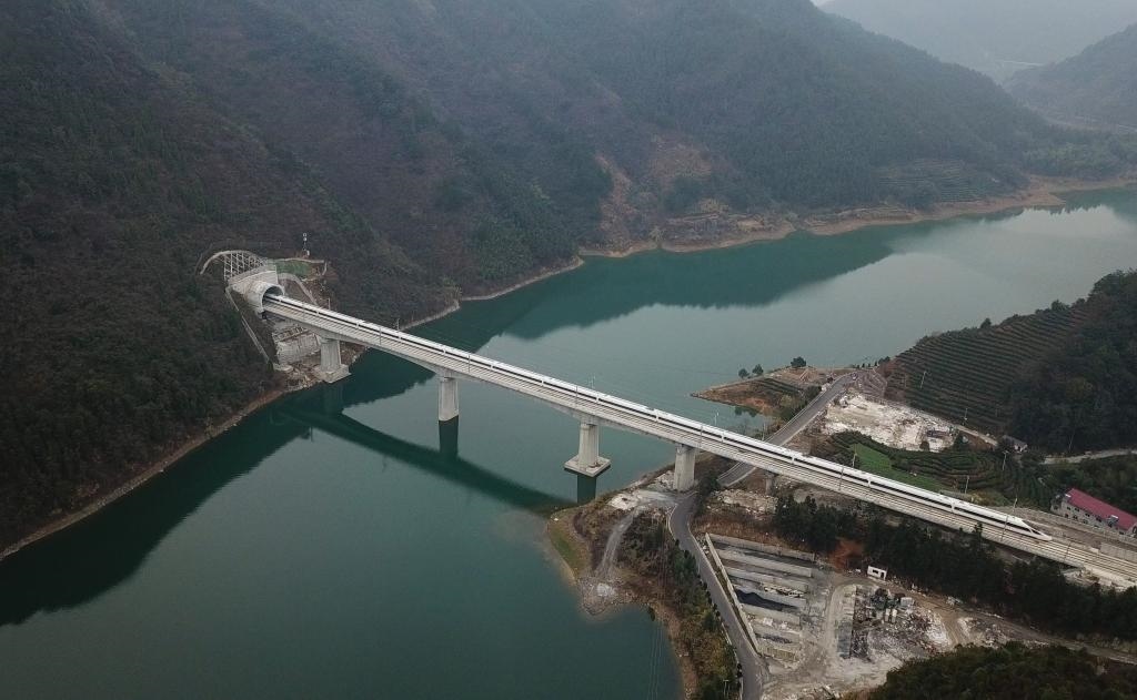 圖為“復(fù)興號”列車行駛經(jīng)過杭黃高鐵位于浙江淳安的進賢溪大橋(無人機拍攝)。新華社記者 黃宗治 攝