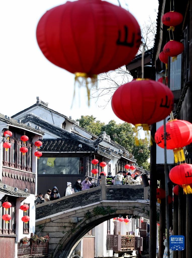 1月27日,游客在江蘇省蘇州市山塘街觀光游覽。新華社發(fā)(杭興微 攝)