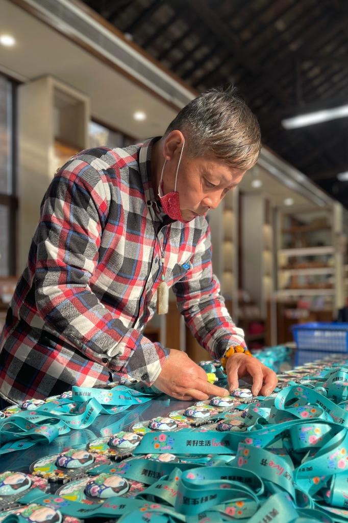 惠山泥人廠高級工藝美術(shù)師周漢慶在檢驗登山節(jié)完賽獎牌。新華社記者 朱國亮 攝