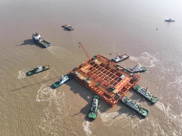 施工單位結(jié)合5號墩基礎(chǔ)施工條件,采用自浮式鉆孔平臺方案,自浮式鉆孔平臺由“鋼樁+鋼架”作為主要承重結(jié)構(gòu),在底部設(shè)置浮箱結(jié)構(gòu),使其具備自浮功能;平臺長130米、寬100米,重達(dá)7600噸,平面面積達(dá)13000平方米,相當(dāng)于31個標(biāo)準(zhǔn)籃球場大小。