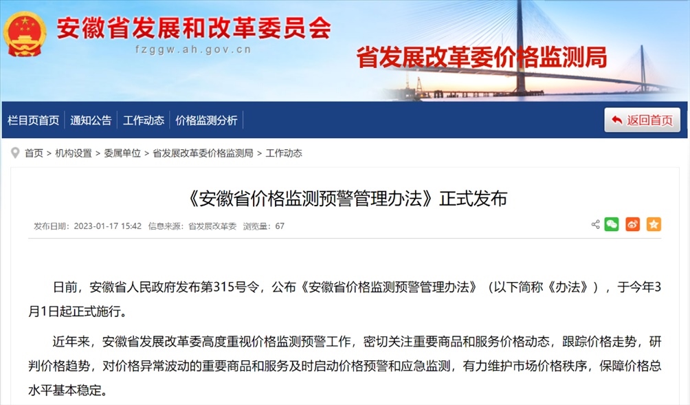 《安徽省價(jià)格監(jiān)測預(yù)警管理辦法》。圖片來源:安徽省發(fā)展和改革委員會(huì)