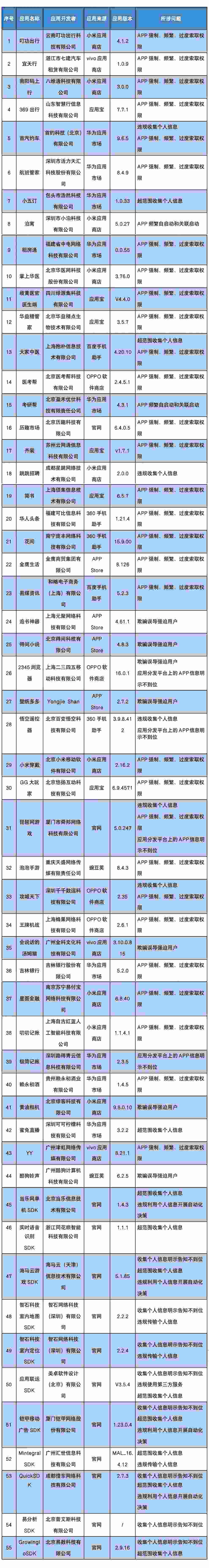 人民網(wǎng)北京3月21日電 (記者申佳平)據(jù)工業(yè)和信息化部官方微信公眾號“工信微報”消息,近期,工業(yè)和信息化部組織第三方檢測機構(gòu)對群眾關(guān)注的生活服務(wù)、休閑娛樂、實用工具等移動互聯(lián)網(wǎng)應(yīng)用程序(APP)及第三方軟件開發(fā)工具包(SDK)進行檢查,發(fā)現(xiàn)55款A(yù)PP(SDK)存在侵害用戶權(quán)益行為。