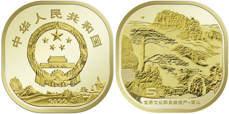 世界文化和自然遺產(chǎn)——黃山普通紀(jì)念幣正面圖案為中華人民共和國國徽,國徽上方刊“中華人民共和國”國名,下方為裝飾風(fēng)格的黃山圖案并刊年號“2022”字樣;背面主景圖案為迎客松和黃山山峰等,主景圖案下方刊“世界文化和自然遺產(chǎn)——黃山”字樣和面額“5元”字樣。