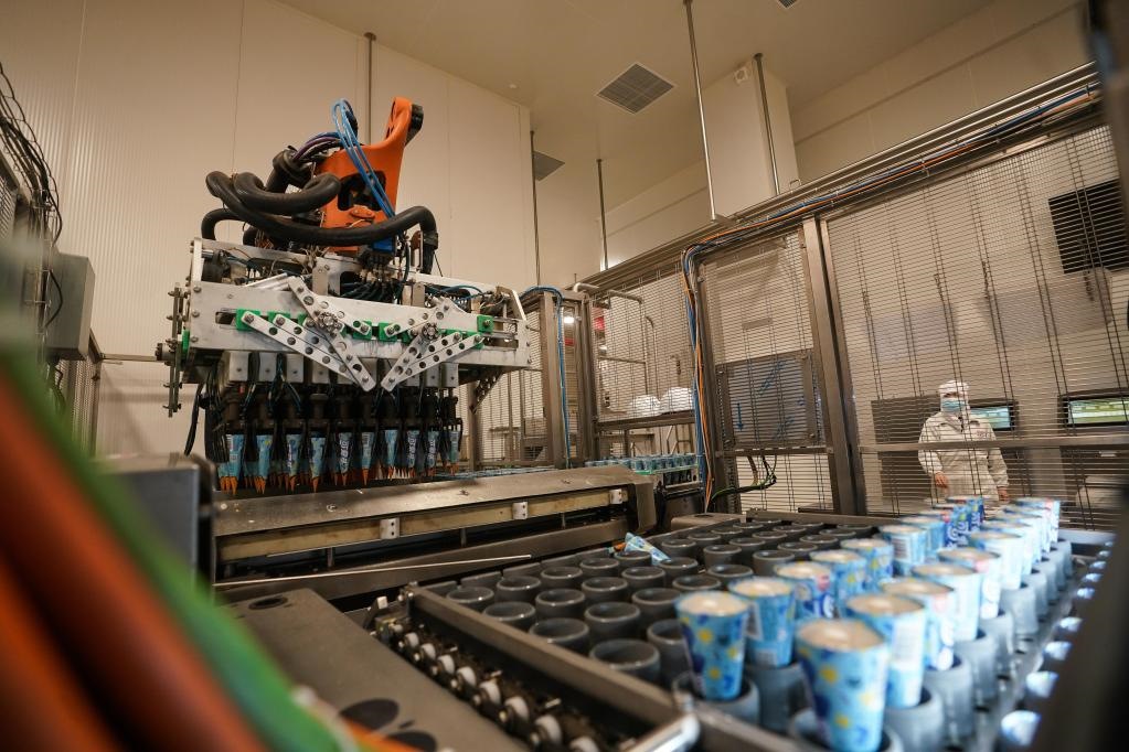 位于江蘇蘇州太倉(cāng)的聯(lián)合利華和路雪生產(chǎn)基地,于2021年9月獲評(píng)全球“燈塔工廠”,成為當(dāng)?shù)亍爸悄苤圃臁钡臉?biāo)桿。工廠里,機(jī)器人正將產(chǎn)品轉(zhuǎn)移到速凍隧道。新華社記者 季春鵬 攝