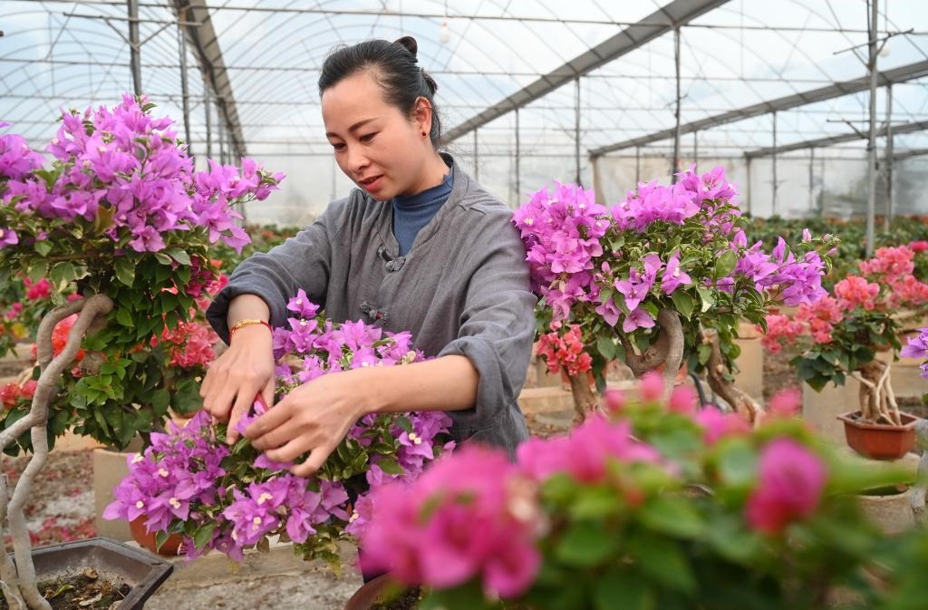 2月28日,在福建漳州大千園藝三角梅種植基地,員工在修剪三角梅盆栽。新華社記者 林善傳 攝