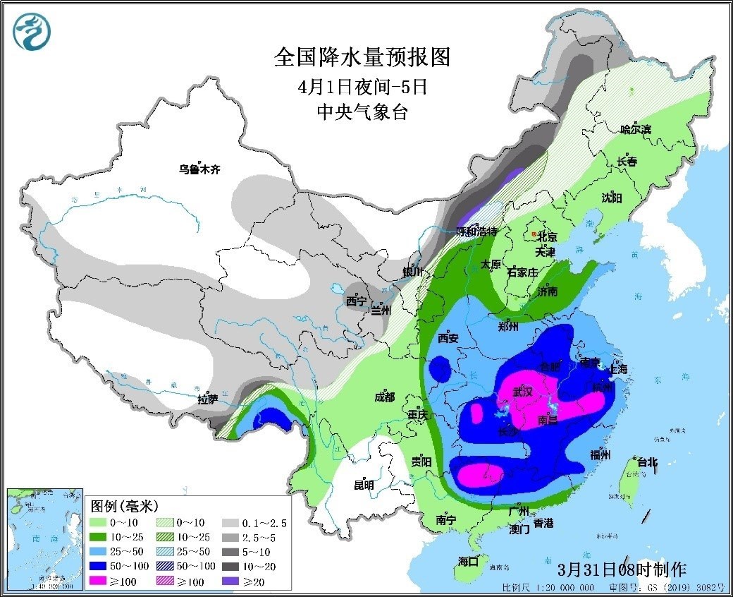 4月1日夜間至5日,甘肅東部、寧夏、河北北部和內蒙古中東部等地有中到大雪或雨夾雪,內蒙古中部等地局地暴雪或大暴雪,主要降雪時段為2日至3日;西北地區(qū)東南部、西南地區(qū)東部、江漢、江淮、江南、華南以及黃淮等地有中到大雨,其中河南東南部、湖北東部、湖南、安徽、江西、浙江西部、廣西北部、廣東北部和福建西部等地的部分地區(qū)有暴雨,局地大暴雨;主要降水時段為2日至4日。上述地區(qū)累計降水量20-50毫米,部分地區(qū)有70-120毫米,局地可達160毫米;100毫米以上降雨覆蓋面積達23萬平方公里。江淮及以南地區(qū)伴有短時強降水、雷暴大風或冰雹等強對流天氣,最大小時降水量30-60毫米;江南北部、江漢東部、江淮等地伴有10級以上雷暴大風。