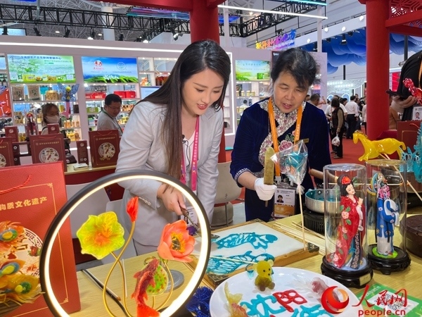 “我們的糖人制作技藝興于清朝道光年間,技法分為吹、塑、畫(huà)。結(jié)合消費(fèi)新需求,我們推出了一些新產(chǎn)品,很受年輕人喜歡。在消博會(huì)上,通過(guò)展示糖人技藝,讓更多的消費(fèi)者了解傳統(tǒng)文化,喜歡上我們的作品?!鄙蜿?yáng)李氏糖人制作技藝第五代傳承人李鳳艷表示。