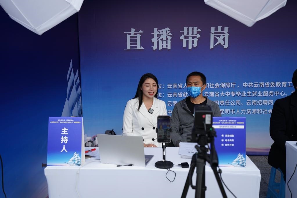 2023年3月3日,在云南省2023年春風行動暨就業(yè)援助月專場招聘活動現(xiàn)場,工作人員“直播帶崗”。新華社記者 佟璐 攝