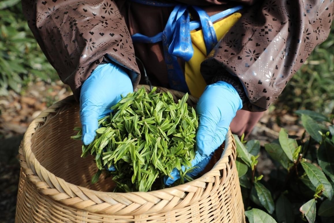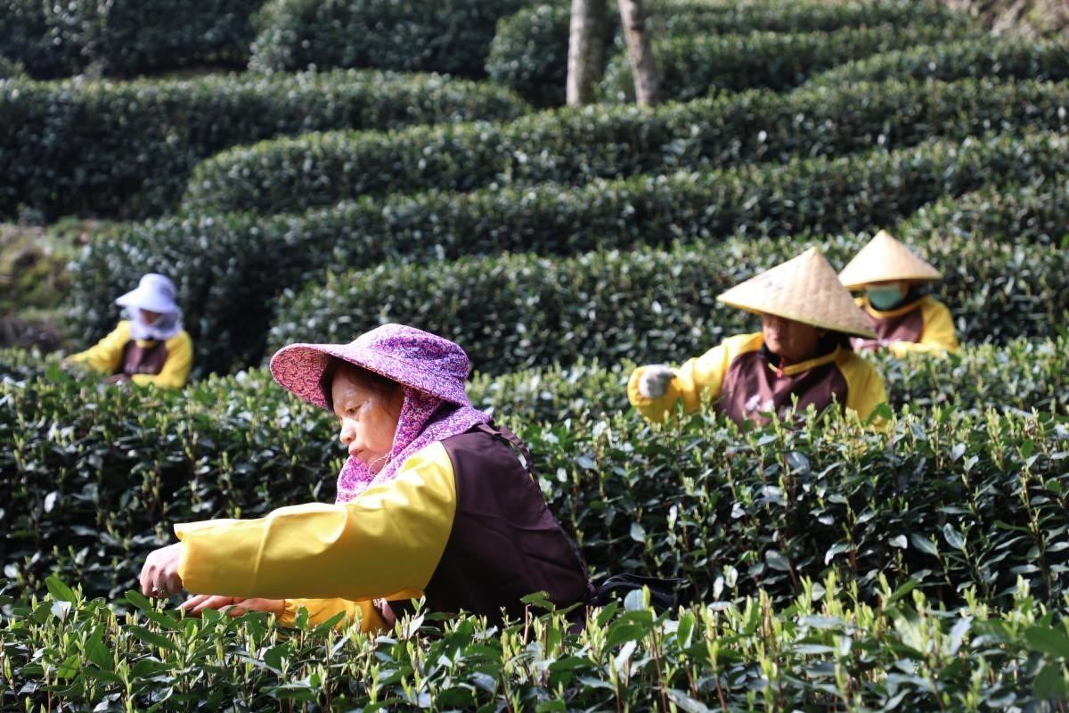 像林阿姨這樣熟練的采茶工,從早上七點(diǎn)多開(kāi)始,一直采到下午五點(diǎn),預(yù)計(jì)能采4斤鮮葉,約可產(chǎn)出1斤的干茶?!敖衲甑牟枞~賣(mài)相好、顏色正、大小均勻。你看這葉片多漂亮!”林阿姨一邊說(shuō)著一邊低頭忙碌。