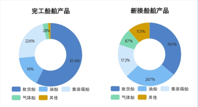 具體來看,在1—3月新接船舶產品訂單結構中,占比最高的散貨船為36.1%,油船占比26.7%,集裝箱船占比17.2%,氣體船占比8.7%。在完工船舶產品結構中,散貨船占比57.4%,集裝箱船占比22.6%,油船占比16%,氣體船占比2.8%。