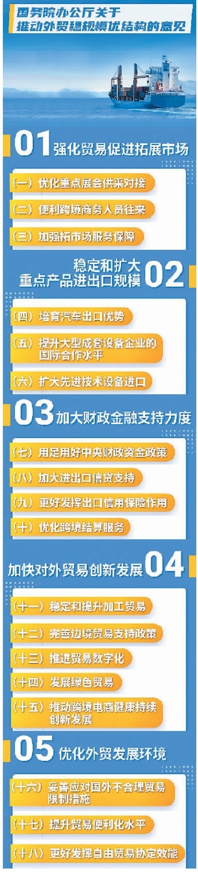 為推動外貿(mào)穩(wěn)規(guī)模優(yōu)結(jié)構(gòu),在前期已出臺多輪政策舉措的基礎(chǔ)上,國務(wù)院辦公廳4月25日對外發(fā)布《關(guān)于推動外貿(mào)穩(wěn)規(guī)模優(yōu)結(jié)構(gòu)的意見》(以下簡稱《意見》),推出新一輪措施。專家認(rèn)為,此次提出的18條具體措施既涉及重點(diǎn)產(chǎn)品,也關(guān)乎市場拓展和貿(mào)易創(chuàng)新,具有很強(qiáng)的針對性和操作性,有助于穩(wěn)住外貿(mào)規(guī)模,并在此基礎(chǔ)上進(jìn)一步優(yōu)化外貿(mào)結(jié)構(gòu),推動實(shí)現(xiàn)全年進(jìn)出口促穩(wěn)提質(zhì)目標(biāo)任務(wù)。